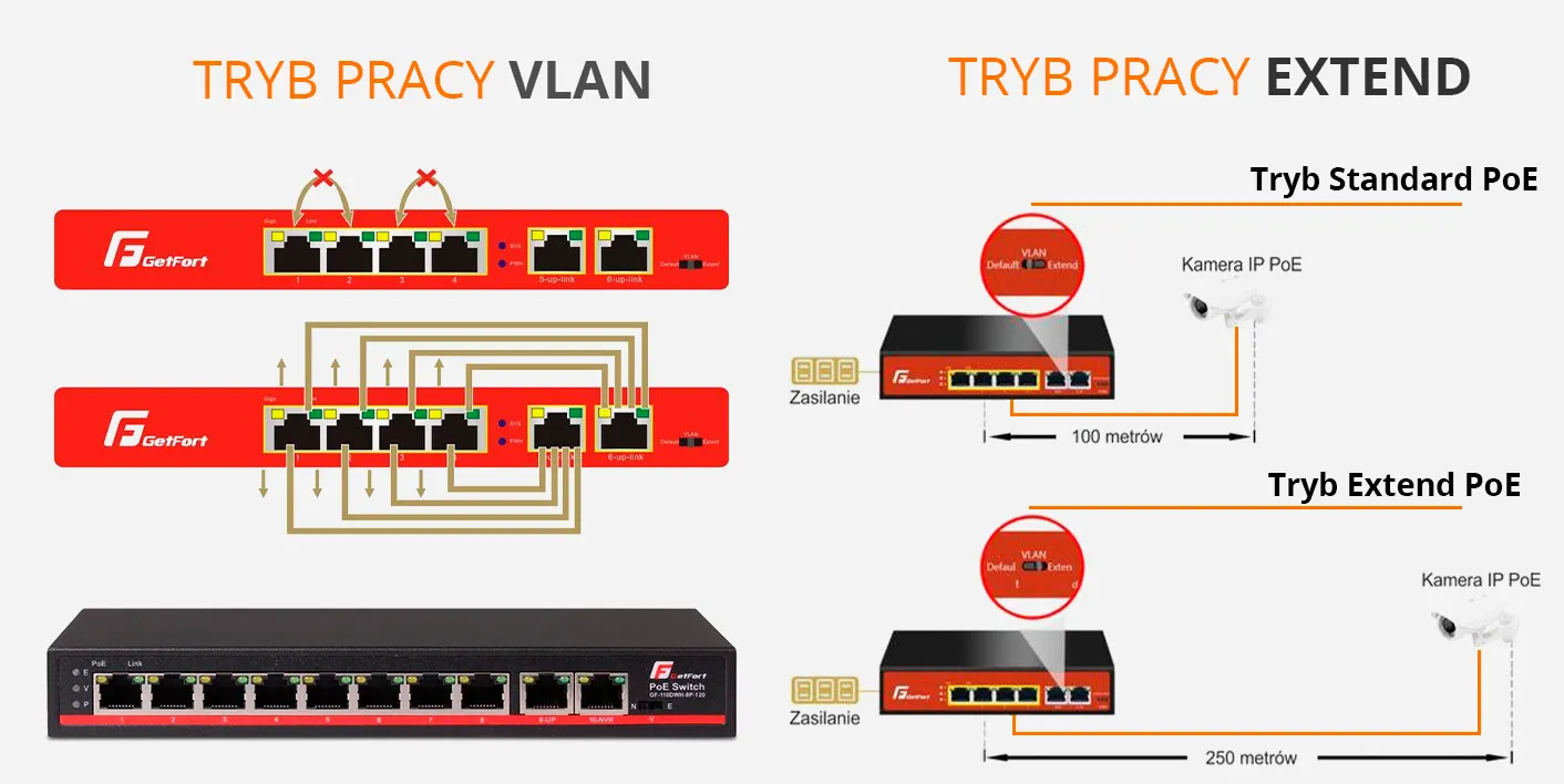 Tryby pracy VLAN oraz EXTEND switcha POE GETFORT